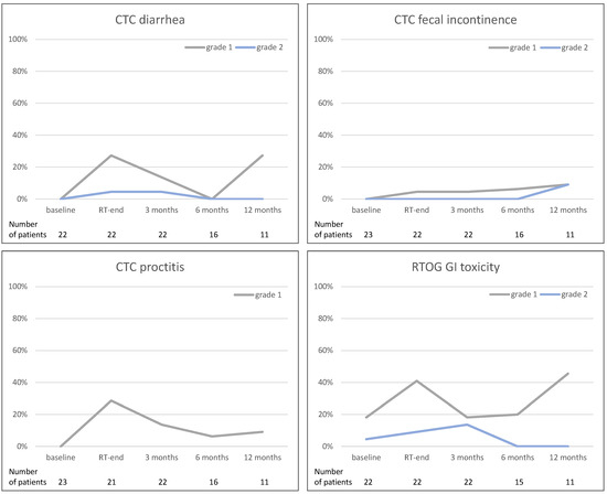 Gastrointestinal toxicity reported as CTC diarrhea, fecal incontinence and proctitis, as well as RTOG GI toxicity are demonstrated in Figure 3. No G3+ toxicity was observed. For CTC diarrhea and RTOG GI toxicity, from 6 months after the end of RT onwards, no patients reported on any G1+ toxicity. One patient reported grade 1 rectal bleeding at the end of RT and at 3 months post-RT, whereas no rectal bleeding was scored as late toxicity at further follow-up. Regarding rectal ulcers, two patients reported on toxicity grade 1 at 12 months. Furthermore, a slight increase in G1 and/or G2 toxicity rates was demonstrated 12 months after the end of RT (CTC diarrhea, CTC proctitis, CTC fecal incontinence, RTOG GI toxicity).