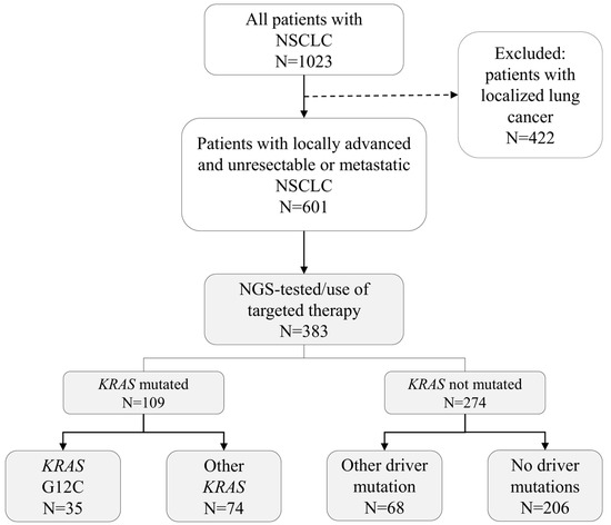 Furthermore, only incident NSCLC patients whose disease was or progressed to advanced or metastatic during 1 January 2018 to 31 August 2020 were included in our study. This inadvertently excluded patients with slower disease progression, whose disease advanced after our inclusion period. This may have led to overrepresentation of patients with more aggressive disease (i.e., advanced or metastatic disease already at the diagnosis of NSCLC or early relapse). This and including both treated patients and patients with BSC only may explain the relatively short median OS of 2.9 months in the KRAS G12C group compared to other studies, e.g., [27,28,29]. More studies with larger cohort sizes (to be able to separate treated patients and patients with BSC only in outcome analyses) and aiming to include also later relapses are needed to assess these aspects.