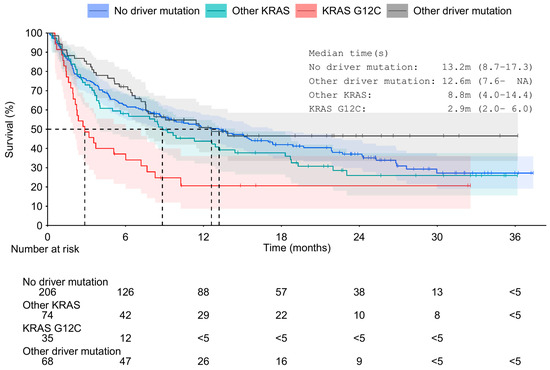 The following supporting information can be downloaded at: https://www.mdpi.com/article/10.3390/curroncol31050205/s1, Figure S1: Cox model for OS including also treatment status, performance status, and tumor stage as covariates. The proportional hazard assumptions were violated for these additional covariates and thus, the hazard ratios represent an average risk over time. Figure S2: Time to next treatment of the first treatment line by KRAS subgroups using a competing risk model (death as competing risk). Event-free survival (blue curve) indicates the composite event of start of the next treatment line and death. Median TTNT from the event-free survival: KRAS G12C 2.8 months (95% CI 1.2–5.2), other KRAS 6.9 months (95% CI 3.4–10.4), other driver mutation 10.1 months (95% CI 5.7–16.5), no driver mutations 7.9 months (95% CI 6.3–11.1).