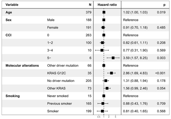 In general, OS was shorter for patients with KRAS mutation than for patients with or without other driver mutations (p = 0.002; Figure 2). The shortest median OS of 2.9 months (95% CI 2.0–6.0) was observed for patients with the KRAS G12C mutation, and the longest median OS of 13.2 months (95% CI 8.7–17.3) for patients without any driver mutation. Based on the Cox proportional hazards model (Figure 3), higher age, CCI 5 or above, and KRAS G12C status were significantly associated with the survival probability. Each additional 10 years in age increased the risk of death by a factor of 1.22 (HR for each additional year being 1.02, 95% CI 1.00–1.03, p = 0.019) and KRAS G12C mutation by a factor of 2.86 (95% CI 1.69–4.83, p < 0.001) compared to patients with a driver mutation in another gene. Patients with unknown smoking status (1%) were excluded from the model. When adjusting the model also by treatment status, performance status, and tumor stage (Supplemental Figure S1), the HR for KRAS G12C was slightly lower (1.75, 95% CI 1.01–3.04) but still significant (p = 0.048).