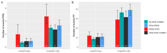 On average, patients with locally advanced and unresectable or metastatic NSCLC had three to five outpatient visits and spent 1–2 days hospitalized PPM (Figure 4A). The PPM HCRU was somewhat higher for patients with KRAS G12C than for the other subgroups. The related costs were EUR 2600 PPM (95% CI EUR 1800–3900) for patients with KRAS G12C, EUR 1600 PPM (95% CI EUR 1300–2100) for patients with other KRAS mutation, EUR 1500 PPM (95% CI EUR 1100–2000) for patients with other driver mutation, and EUR 1400 PPM (95% CI EUR 1200–1600) for patients without any driver mutations. On the other hand, the per patient HCRU (total from index to death or EOF) varied less between the subgroups (Figure 4B) being 30–40 outpatient visits and two hospitalization periods lasting in total 8–12 days.