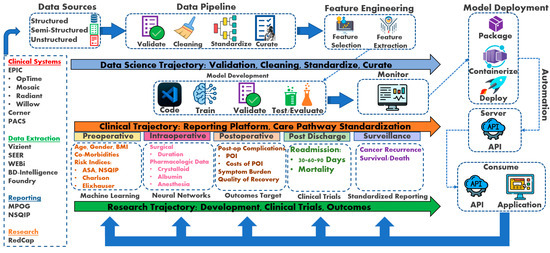 Supervised machine learning has become increasingly important in surgery, anesthesia, and perioperative care. Ensemble techniques, such as random forests and boosting, combine multiple models for improved prediction accuracy [41,42,43,44,45,46,47,48]. Neural network techniques are also being applied in anesthesiology and perioperative medicine to predict outcomes [51,53,56,57]. ML technology can help to allocate resources more efficiently across the perioperative continuum [58]. Due to the volume and complexity of data, successfully incorporating ML or NNs requires a structural framework. Three trajectories, data science, clinical, and research, comprise the core framework for developing an outcomes program (Figure 1).