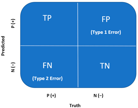 Through logistic regression, classification predictions can be made. A confusion matrix is used to evaluate the classification model after training and validation for accuracy, recall, precision, and F1 scores. A confusion matrix is a quantification of the False Positives and False Negatives, which is well known across the medical field. A confusion matrix is a 2 × 2 matrix summarized by the following (Figure 3) [21].