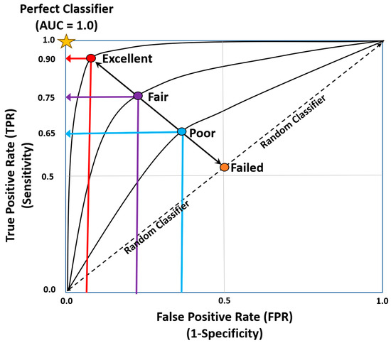 Further extrapolation of clinical classification problems can be achieved by utilizing receiver operator characteristic curves (ROC) and thresholds to determine the output probability (Figure 4) [22]. ROC curves plot False Positive rates against True Positive rates, where the area under the curve measures how well the model performs. The AUC measures how well the model performs (Table 3) [22].