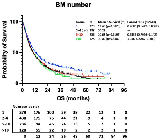 Median survival is similar between all patient groups with more than 1 BM (Figure 1). Whilst the difference in survival between those with 1 BM and those with 2–4 BMs reaches statistical significance (12.49 vs. 10.22 months, p = 0.0025), the difference between 2–4 BMs and 5–10 BMs or >10 BMs is not statistically significant based on univariable analysis (10.22 vs. 10.68 months, p = 0.6196; and vs. 10.09 months, p = 0.6882, respectively).