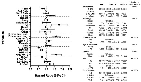 The likelihood ratio test results reveal driver mutation status, KPS, and total tumour volume to be the most important predictors of survival (each p < 0.0001). When looking at the intra-group pair comparisons, total tumour volume <1.5 cc is particularly significant when compared with the 1.5–4.5 cc reference group (p = 0.003), as are KPS 100, 90, and <70 compared to KPS 80 reference (p < 0.0001, p = 0.0002, p < 0.0001, respectively).