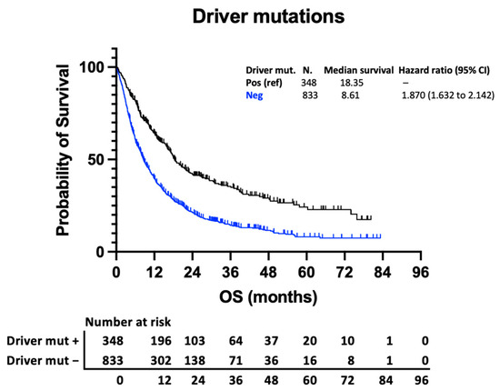 Variations in survival within other prognostic subgroups are considerably greater than variation from the number of BMs. This is illustrated in Figure 3a, comparing outcomes of patients with more (breast) and less (GI) favourable histology, and Figure 3b, comparing outcomes of those with and without driver mutations. To demonstrate the point clearly, the outcomes of those with 1 BM in the less favourable group are compared with those with >10 BMs in the more favourable group. Patients with breast cancer and >10 BMs have a higher median survival than those with GI cancer and a solitary BM (13.55 vs. 5.29 months) (Figure 3a). Similarly, those with an actionable driver mutation have a survival advantage compared to those without (18.35 vs. 8.61 months) (Figure 4). When subdivided by number of metastases, there is a stepwise reduction in survival from those with 1 BM with a driver mutation to those with >10 BMs without a driver mutation (Figure 3b), with a clinically relevant longer survival in those with >10 BMs and a driver mutation than those with 1 BM and no driver mutation (16.14 vs. 10.22 months).