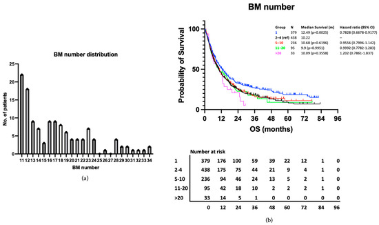 (a) Range and distribution of BM number in the >10 BMs group. (b) Kaplan–Meier curve presenting survival according to no. of BM groups, including the >20 BMs subgroup.