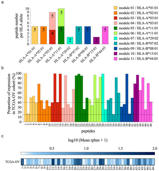 48 TSAs presented by nine common HLA allotypes and highly shared by ovarian tumors. (a) Number of peptides included per HLA allotype and repartition in 11 vaccine modules. Bars indicate the number of peptides in each module. (b) Proportions of samples from the TCGA ovarian cohort expressing the peptide coding sequences (rphm > 0) for each TSA. The dotted lines represent sharing frequencies of 15% and 40%. (c) Heat map representing peptide coding sequences expression (log(rphm + 1)) in the TCGA ovarian cohort (mean from 377 samples).