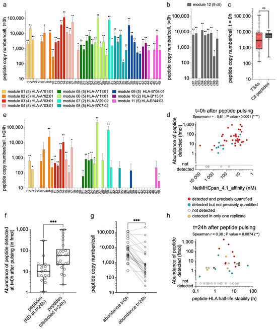 TSAs are well presented by moDCs after peptide pulsing. (a) Bars show the peptide copy number per cell detected by MS analyses for the 48 TSAs at t = 0 h after moDCs pulsing with individual synthetic peptide modules. Analyses were performed in three biological replicates (three different donors) (see Tables S1 and S3 for details on modules and donors, respectively). Each module is color-coded and annotated with its respective HLA and the number of TSAs. (b) Bars depict the peptide copy number per cell detected by MS analyses for nine control peptides known as immunogenic, at t = 0 h after moDCs pulsing with synthetic peptides (module 12; Table S4). The positive control peptides were analyzed for every donor included in these MS experiments, expressing the proper HLA (eight donors, three to four replicates for each HLA allotype of interest; see Table S3 for details on donors). (c) Peptide copy numbers obtained at t = 0 h after pulsing were compared between TSAs and positive control peptides using a non-parametric t-test (Mann–Whitney), showing no significant difference (ns) between these two groups. Each symbol represents the mean of replicates per peptide. (d) Correlation between the TSAs abundance detected by MS (in fmol) at t = 0 h after pulsing and the predicted binding affinity obtained from NetMHCpan_4.1 (low value in nM means high affinity). **** p < 0.0001. (e) The peptide copy number per cell was obtained from MS analysis for the 48 TSAs at t = 24 h after moDCs pulsing with peptide modules. Panels (a,b,e): ** detected and precisely quantified in at least two replicates, * detected but not precisely quantified in at least two replicates, no star = detected in only one replicate. (f) The abundance of peptides detected by MS at t = 0 h after pulsing (in fmol) for peptides detected (at least one replicate) or not by MS 24 h after pulsing. The two groups were compared using non-parametric t-tests (Mann–Whitney), ***; p-value = 0.0002. (g) Comparison of peptide copy number/cell detected by MS at t = 0 h and t = 24 h after peptide pulsing for each peptide detected in at least one replicate, 24 h after peptide pulsing. The two groups were compared using a Wilcoxon matched-pairs signed rank test, ***; p-value = 0.0005. (h) Correlation between the TSAs abundance detected by MS (in fmol) at t = 24 h and the predicted half-life stability of peptide–HLA complexes obtained from NetMHCstabpan_1.0. **; p-value = 0.0074. Panels (d,h): Spearman correlation coefficients and p values are indicated below the titles.