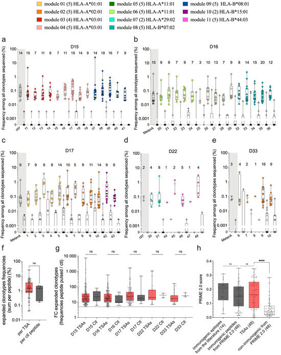 TCR Vβ CDR3 sequencing shows clonotype expansion following coculture with TSA-pulsed moDCs. Naïve CD8 T cells were cocultured with moDCs pulsed with one peptide and compared to naïve CD8 T cells cocultured with unpulsed moDCs. TCR Vβ CDR3 sequences were analyzed using the web platform MANAFEST [38]. Only clonotypes classified as significantly expanded in one peptide-pulsed condition (compared to the unpulsed condition) are represented. (a) Frequencies of expanded clonotypes among all clonotypes sequenced in each sample obtained with donors D15, (b) D16, (c) D17, (d) D22, and (e) D33. Each symbol represents the frequency for one expanded clonotype in the peptide-pulsed condition (circles) and its respective frequency in the unpulsed condition (triangles). (a–e) As positive controls, known immunogenic peptides were included according to the HLA genotype of each donor (MelanA binding HLA-A*02:01 or ctl7 binding HLA-B*08:01, highlighted in grey). Each TSA was tested in one donor (panels (a–d)), except peptides from module 2 (HLA-A*02:01, TSAs 6 to 10 in orange) tested in 2 different donors (panels (c,e)). The number of significantly expanded clonotypes found per TSA or control peptide is represented above each sample. (f) The sum of all expanded clonotype frequencies was calculated for each peptide condition (Table S5). Each symbol represents one peptide condition, and results obtained from TSAs were compared to positive control peptides. (g) Fold change of expansion (frequency in [peptide-pulsed/unpulsed] condition) is represented for each significantly expanded clonotype (each point). Results are grouped by donors and compared between TSAs and positive control conditions. (f,g) pink boxes represent TSAs; grey boxes represent positive control peptides. (h) PRIME score prediction of T-cell recognition (Table S6): immunogenic control peptides extracted from the literature (14), the 48 TSAs analyzed in this study, and a selection of immunogenic and non-immunogenic peptides used to train PRIME2.0 (48 peptides each). Pink represents the TSAs, grey represents the groups of immunogenic peptides, and white represents the non-immunogenic peptides. (f–h) statistical analyses were done using non-parametric t-tests (Mann–Whitney), where ns stands for not significant; **** p-value < 0.0001.
