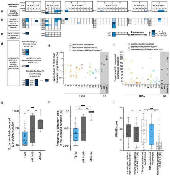 Expansion of tetramer-positive cells following coculture with TSA-loaded moDCs. Naïve CD8 T cells were cocultured with moDCs using different peptide loading experimental conditions and methods: (a) moDCs pulsed with each peptide individually, (b) moDCs pulsed with peptides pooled per module, and (c) moDCs electroporated with mRNA minigenes coding for peptides from modules 1, 2, or 6. Each peptide was tested in 3 to 6 different donors (donor codes are indicated on the left of each module; see details in Table S3) and with 2 or 3 different experimental conditions for peptide loading (a–c). The unpulsed moDCs condition is used as a negative control for specific expansion. (d) The positive control condition assessed the proportion of tetramer-positive cells following stimulation with moDCs pulsed with ctl6, ctl7, or MelanA (according to the donor HLA genotype) in each donor from panels (a–c). Panels (a–d): The frequencies of tetramer-positive CD8 T cells (in %) are represented following a blue intensity gradient. Tetramer-positive CD8 T cells were only considered expanded and described in the figure if expansion folds ≥ 10 compared to the negative control condition. (e) Frequencies of tetramer-positive CD8 T cells detected after functional expansion for TSAs and positive control peptides. (f) Compared to the unpulsed condition, the expansion fold of tetramer-positive CD8 T cells is represented for each TSA and positive control peptide. (g) The expansion fold of tetramer-positive CD8 T cells for all TSAs (in blue) was compared to the ctl7/ctl6 and MelanA groups. Individual points represent replicates of significantly expanded ag-specific T cells. (h) Frequencies of tetramer-positive CD8 T cells obtained in the unpulsed condition (see Section 2.6.2 for details). Panel (e–h): Only peptides for which expansion was observed in panels (a–c) or (d) are represented. (i) PRIME score comparison between TSAs groups for which we detected (13) or not (26) T-cell expansion by tetramers, immunogenic epitopes from the literature (14), and a selection of immunogenic or non-immunogenic peptides used to train PRIME2.0 (48 peptides each) (Table S6). Panels (g–i); groups were compared using non-parametric t-tests (Mann–Whitney), where ns stands for not significant; **** p-value <0.0001, *** p-value = 0.0009 (panel (g)) or p-value = 0.006 (panel i), and ** p-value = 0.0095 (panel (h)).