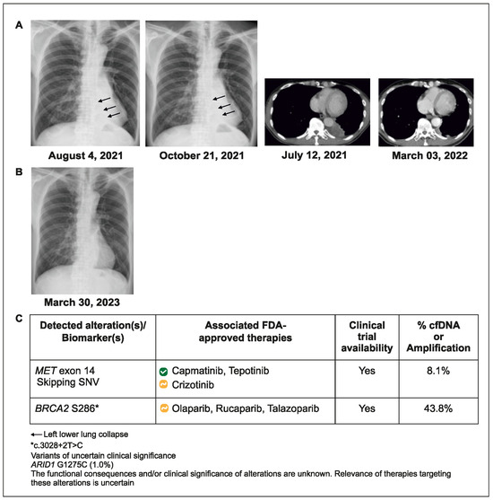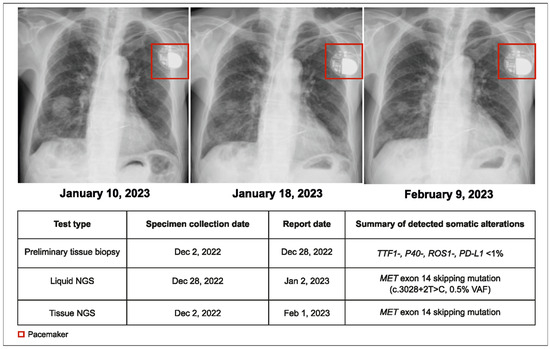 A 70-year-old man with advanced NSCLC and metastases to the lung and brain underwent standard tissue hotspot testing for EGFR, ALK, and ROS 1, with no actionable alteration detected in EGFR, ALK, or ROS1. No NGS was performed on the initial tissue biopsy. Since tumor PD-L1 staining was >95%, he was treated with pembrolizumab plus bevacizumab. After 1.5 months of treatment, disease progression occurred, accompanied by left lower lung collapse. Blood-based CGP testing was ordered, and METex14 skipping mutation was detected within 7 days. The patient’s treatment was switched to capmatinib for 5 months (showing partial response), followed by tepotinib (due to declining renal function), which remains ongoing after 1 year (Figure 2).