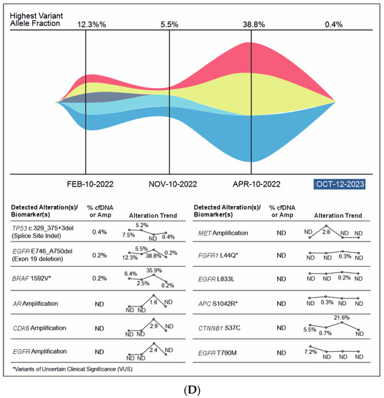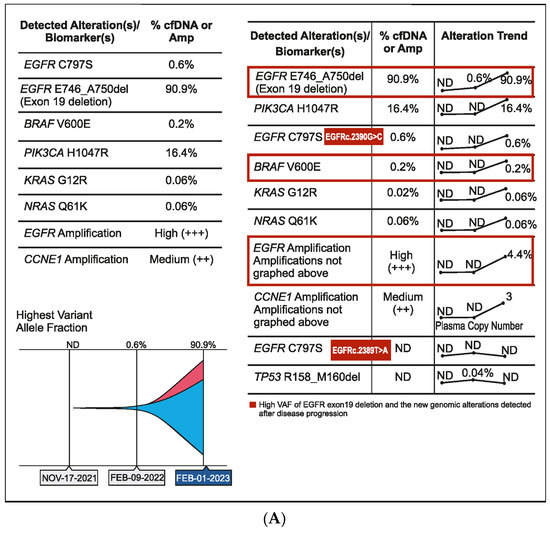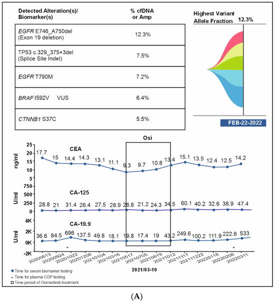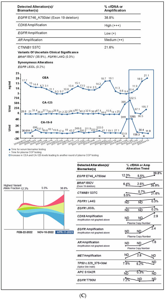 A 56-year-old male patient was diagnosed in September 2020 with EGFR-mutated (exon 19 deletion) advanced NSCLC. He had lung, brain, and bone metastases along with pleural effusion and was treated with osimertinib. Drainage of the pleural effusion was performed three months after the initial diagnosis, and bevacizumab was added to osimertinib. An increase in serum carcinoembryonic antigen (CEA) (11.2 ng/mL), cancer antigen 19-9 (CA19-9) (11.2 U/mL), and cancer antigen 125 (CA 125) (24.8 U/mL) was detected after a year of treatment and no changes observed on the scan. However, plasma CGP testing showed no tumor-related somatic alterations. Three months later, as CEA (18.9 ng/mL) and CA125 (42.4 U/mL) levels continued to rise, but no changes were observed on the scans, a second plasma CGP test was conducted. An EGFR exon 19 mutation (E746_A750 deletion; 0.6% VAF) was detected along with two subclones encoding EGFR C797S (EGFRc.2390G > C, variant allele frequency (VAF) 0.1%; EGFRc.2389T > A, VAF 0.04%), which were confirmed to be in trans to the driver mutation (Figure 4A). Treatment was changed to afatinib in March 2022, followed by osimertinib plus erlotinib in June 2022 for two months. Switching of treatment to osimertinib plus erlotinib was carried out because there was no improvement with osimertinib plus bevacizumab and EGFR C797S mutation (resistant to third-generation EGFR TKIs but sensitive to first- and second-generation EGFR TKIs) was detected in the patient. However, CEA (61.8 ng/mL) and CA125 (130.8 U/mL) levels continued to increase. The patient showed no improvement in symptoms and had abdominal pain and diarrhea. In July 2022, a PET scan detected peritoneal metastasis, and chemotherapy (pemetrexed/carboplatin/bevacizumab) was administered. Six months later, serum CA125 increased to 1580 ng/mL, and a third liquid CGP testing was ordered. EGFR amplification was detected along with EGFR exon 19 deletion and one of the previously detected EGFR C797S subclones (EGFRc.2390G > C) along with other new genomic alterations, including PIK3CA H1047R (VAF 16.4%), BRAF V600E (VAF 0.2%), KRAS G12R (VAF 0.06%), NRAS Q61K (VAF 0.06%), and CCNE1 amplification (medium plasma copy number 3) (Figure 4A,B). Accordingly, the treatment regimen was switched to a combination of afatinib (30 mg), cetuximab (150 mg/m2 every two weeks), dabrafenib (75 mg BID), and trametinib (2 mg QD) due to the detection of BRAF V600E and EGFR amplification after disease progression. The patient showed a dramatic response in one week but succumbed to a myocardial infarction after one month of therapy.