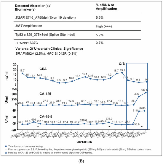 The main goal in the clinical management of advanced NSCLC is to control tumor progression while maintaining an acceptable quality of life for the individual patient. Serum tumor biomarkers (such as CEA, CA19-9, CA125), released by tumor cells or immune cells in response to tumor growth, play an important function in clinical diagnosis, prognosis, and anti-drug surveillance, as well as in predicting therapeutic outcomes in NSCLC. They are found to be useful in measuring chemotherapy response [29]. Additionally, these biomarkers can be employed as useful prognostic indicators in addition to PD-L1 in ensuing clinical applications. Moreover, their routine measurement in clinical settings may serve as a simple and reliable method for estimating the effectiveness of immunotherapy [30]. Furthermore, imaging tools are routinely used for diagnosis, staging, and monitoring the clinical response to an intervention in lung cancer management. Although these diagnostic tools alone may not be useful in treatment decisions due to their low sensitivity and specificity, they can help in appropriate interventional decisions when used in combination with CGP. Many studies of cfDNA NGS focus on biomarker discovery rates, but some correlate biomarker detection to the clinical efficacy of targeted therapies [31,32,33,34]. In the sixth patient scenario, elevations in serum biomarker levels were correlated with changes in actionable mutations and guided treatment decisions throughout the patient’s disease course. It is thus essential to consider all available diagnostic options, including CGP of tissue and blood, imaging, and serum biomarkers, to obtain a complete picture of the patient’s disease and to guide clinical judgment.