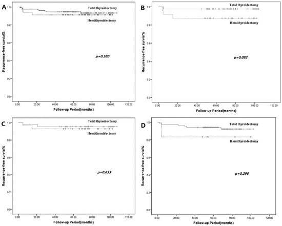 Recurrence-free survival curves in the total thyroidectomy and hemithyroidectomy groups before (A) and after (B) propensity score matching. Recurrence-free survival curves between total thyroidectomy and hemithyroidectomy groups in ≤1 cm (C) and >1 cm (D) subgroups. Kaplan–Meier method for recurrence with the log-rank test was used for statistical comparisons.