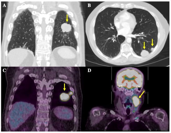CT thorax and 18-Fluorodeoxyglucose (FDG)-PET scans at initial diagnosis. Yellow arrows depict radiological findings. (A) Coronal image from the CT thorax scan showing the largest mass in the left posterior lung base, measuring 2.8 × 3.4 cm in size. (B) Axial image from the CT thorax scan showing an additional view of the metastatic nodules in the posterior left lung. (C) Coronal images of the thorax on the FDG-PET scan show the largest FDG-avid lung mass, in the left posterior lung, and the adjacent hypermetabolic nodule. (D) Coronal images of the head and neck on the FDG-PET scan show a left-sided nodal conglomerate in the neck measuring 3.4 × 4.3 × 6.5 cm along with adjacent hypermetabolic lymph nodes measuring 0.5–0.9 cm (not well demarcated in image).