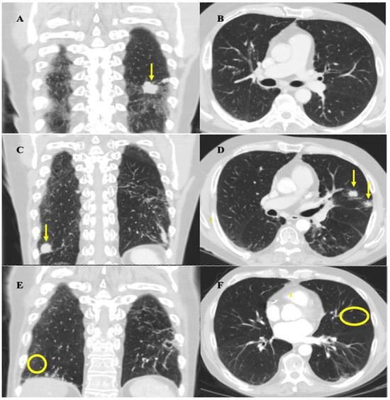 Coronal and axial mid-lung CT thorax images highlighting important stages of disease progression and response to therapy. Images were obtained at approximately the same slices for each time point. (A,B) February 2020 imaging after induction chemotherapy and radiation showing treatment response. (A) Arrow highlights reduction in size of largest left lung nodule from 3.4 × 2.8 cm to 2.7 cm × 1.6 cm. (B) No evidence of metastatic nodules in mid-lung zones of left and right lung zones at the level of the hilum. (C,D) September 2020 imaging showing progression of disease. (C) Coronal view shows resolution of largest left lung nodule but appearance of a new right lung nodule near the costophrenic angle, indicated by the arrow, measuring 1.9 cm. (D) Axial view shows appearance of two new metastatic nodules in left upper lobe, indicated by the arrows, each measuring approximately 1.4–1.5 cm in size. (E,F) March 2021 imaging post rechallenge with chemotherapy and atezolizumab showing near-complete resolution of disease. There is resolution of the nodules seen on the September 2020 scan (circles highlight locations of previously seen, now resolved, lesions). Residual scarring was also observed.