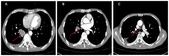 A 58-year-old Chinese male patient was admitted to the Sun Yat-sen University Cancer Center in March 2021, complaining of a persistent cough for two weeks, having smoked for 38 years. Chest computed tomography (CT) revealed a solid mass measuring 40 mm × 30 mm in the lower lobe of the right lung. Enlarged ipsilateral hilar and mediastinal lymph nodes were identified. There was a small amount of pleural effusion in the right chest cavity (Figure 1A–C). The pathology report from the CT-guided lung mass biopsy indicated NSCLC. The cytological examination of pleural effusion revealed no malignant tumor cells. There was no evidence of brain metastases radiographically based on a preoperative brain MRI, and a stage of cT2aN2M0 was determined. Following the completion of relevant preoperative evaluations, the patient underwent curative right lower lobectomy and mediastinal lymph node dissection on 9 March 2021. Pathological examination revealed metastasis to one hilar lymph node, one subcarinal lymph node, and one para-bronchial lymph node. The tumor tissue exhibited poorly differentiated infiltrating adenocarcinoma morphology with spread through airway space (STAS). The gross pathology examination indicated the tumor size was 45 mm × 38 mm × 35 mm, leading to an upgrade in staging to pT2b. According to the 8th edition of the AJCC (American Joint Committee on Cancer) staging system, the disease was diagnosed as stage IIIA adenocarcinoma of the lung (pT2bN2M0).
