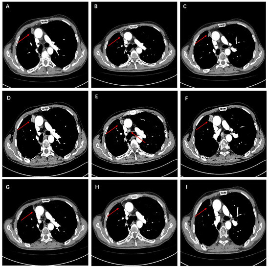 (A–C) At 27 months post-surgery, a follow-up chest-enhanced CT revealed nodules indicative of pleural metastasis on the right side. (D–F) After three months of continued treatment with the original regimen following recurrence, a follow-up CT scan revealed pleural metastatic lesions and enlarged mediastinal lymph nodes. (G–I) After three months of adding bevacizumab to the original regimen, a follow-up CT scan revealed a reduction in pleural metastatic lesions and shrinkage of mediastinal lymph nodes.