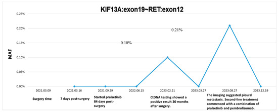 Mutation profiling of ctDNA from peripheral plasma collected one week after surgery and DNA obtained from formalin-fixed paraffin-embedded (FFPE) tumor tissue sections was performed using next-generation sequencing (NGS). The NGS tests, which utilized the LungTrak panel, targeted 139 lung cancer-related genes and were conducted at a centralized, CLIA-certified, and CAP-accredited clinical testing center (Nanjing Geneseeq Technology Inc., Nanjing, China). The sequencing platform used for the study was Illumina. A rare KIF13A-RET fusion involving exon 19 of KIF13A and exon 12 of RET was detected in tumor tissue (Figure 2). Mutations in the TP53, APC and MYC genes were also detected in the tissue sample. CtDNA was not identified in the peripheral plasma one week after surgery. Considering the patient’s long history of smoking and tumor staging, postoperative therapy was recommended. However, the patient declined adjuvant chemotherapy. After further discussion and collaborative decision-making, the patient was started on oral pralsetinib at a dose of 400 mg/d on postoperative day 84. One month after starting the medication, the patient experienced adverse reactions such as fatigue and loss of appetite, prompting a dose adjustment of pralsetinib to 300 mg/d. Upon the patient’s request, ctDNA was monitored at periodic intervals using LungTrak ctDNA testing. The patient’s ctDNA levels, measured using the assay above-mentioned, 7 and 206 days after surgery, were both 0.0% mutation allele frequency (MAF), with repeat ctDNA analysis 12 months after taking pralsetinib indicating persistently negative ctDNA at 0.0% MAF. Due to personal compliance issues, the patient became irregular in taking medication after one year of adherence. In Feburary 2023, after 20 months on pralsetinib therapy, ctDNA assessment identified detectable KIF13A-RET fusion 0.1% MAF. The finding in ctDNA level prompted a chest and upper abdominal enhanced CT scan, which did not reveal any signs of recurrence or metastasis. After 1 month of regular pralsetinib intake, ctDNA test no longer detected the RET fusion. However, repeat CT imaging 3 months later revealed a single nodule in the right pleura, suggesting possible metastasis (Figure 3A–C). On 27 August 2023, ctDNA analysis identified detectable KIF13A-RET fusion 0.2% MAF again. Subsequent restaging imaging revealed growth in the right pleura nodules 3 month prior, and new enlargements were observed in the N4R and N7 nodes, consistent with disease progression (Figure 3D–F). In November 2023, two months after treatment with bevacizumab in conjunction with the original regimen, a follow-up chest CT scan revealed a reduction in both the pleural metastatic lesion and mediastinal lymph nodes compared to previous imaging (Figure 3G–I). Longitudinal ctDNA levels monitoring indicated a clearance to 0.0% MAF in December 2023, consistent with radiological changes. The results of dynamic monitoring of ctDNA during the treatment process are presented in Figure 4.