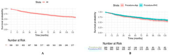 Kaplan–Meier (KM) analysis was used to estimate overall survival probabilities at 1, 12, 36, and 60 months up to the date of death or last follow-up (censored) and to generate KM plots. The log-rank test compared survival plots between the two surgical groups, and a p-value of <0.05 was deemed statistically significant. Both survival analyses were relative survival analyses (not cancer-specific).