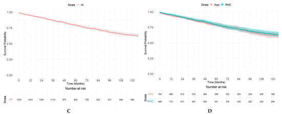 The estimated overall survival (OS) rates from NCRAS at 1 month, 12 months, 36 months, and 60 months were 98.0%, 92.8%, 81.0%, and 73.8%, respectively (Supplementary Table S5). The estimated OS rates from SEER at 1 month, 12 months, 36 months, and 60 months were 98.6%, 95.0%, 87.2%, and 79.6%, respectively (Supplementary Table S5). Figure 1A,C represent KM plots of overall survival for the NCRAS and SEER cohorts, respectively. KM plots comparing the survival of patients receiving RHC (green curves) or appendicectomy (red curves) showed no significant differences in survival curves between the groups on the log-rank test (p = 0.2 NCRAS, p = 0.3 SEER) (B,D).