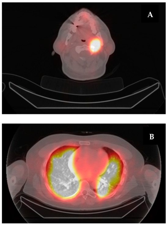 (A) High RAI accumulation in posterior mandibular lymph node. (B) Diffuse, intense, and bilateral RAI uptake in pulmonary tissue.