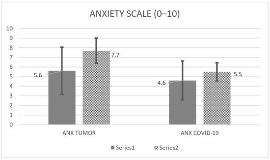 Using a scale of 0–10 for the assessment of anxiety, patients experienced a 5.8 (standard deviation, SD 2.5) anxiety level related to the tumor and a 4.6 (SD 2.2) level related to COVID-19 risk (Figure 1). Caregivers experienced a 7.7 (SD 2.3) anxiety level about the tumor and a 5.5 (SD 2.2) level about COVID-19 risk (Figure 1). No significant correlations were found between patients’ and caregivers’ anxiety concerning the tumor or COVID-19.