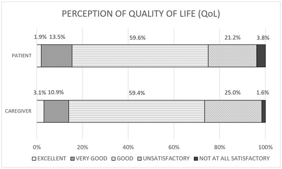Perception of Quality of Life. Rows show the distribution of Quality of Life (QoL) perception, referred to as excellent (pinpoint dot on white background), very good (diagonal line), good (horizontal lines), unsatisfactory (checkered) and not at all satisfactory (pinpoint dot on black background). At the top, patients; below, caregivers.