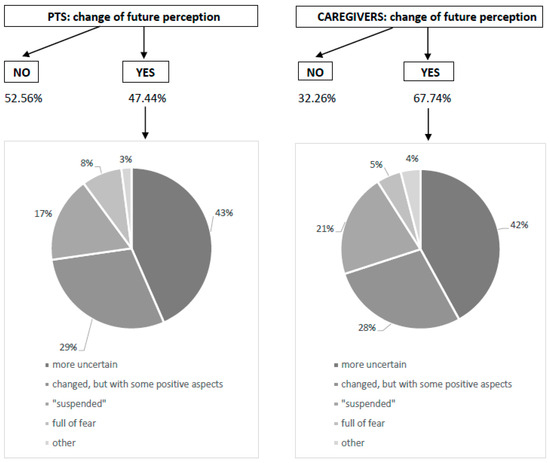 Change of future perception. The graph shows the distribution between the presence or not of modification of future perception, for patients and caregivers, respectively. The pie-chart reports the distribution among the different perception profiles, described as “more uncertain” (very dark gray), “changes, but with some positive aspects” (dark gray), “suspended” (gray), “full of fear” (light gray) and other (very light gray).