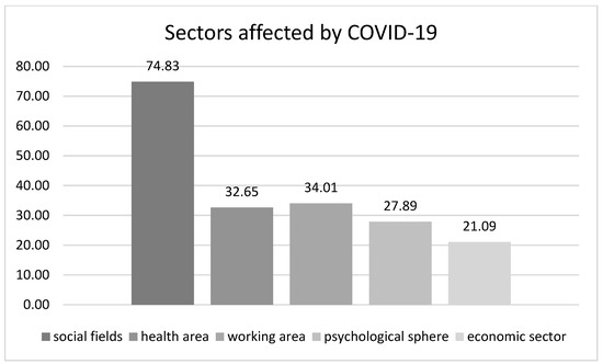 The COVID-19 pandemic influenced mostly the social fields (74.83%) and to a lesser extent the health and work area (32.65% and 34.01%, respectively), the psychological sphere (27.89%), and the economic sector (21.09%) for the patient cohort (Figure 4). Some patients experienced the impact in more than one sector.