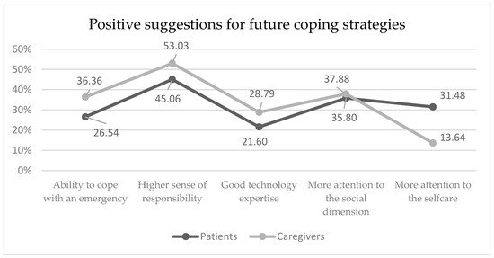 Positive suggestions for coping strategies. The graph shows the difference in the distribution of positive suggestions for improving coping strategies in the future for patients (very dark gray) and caregivers (dark gray).