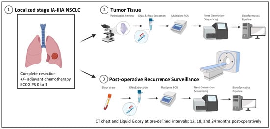 Lung cancer patients with the highest probability of cure are those who present with early-stage non-small cell lung carcinoma (NSCLC; stages I to IIIA) and are amenable to complete surgical resection [1]. However, the five-year overall survival for stage IB disease is estimated at only ~68% [1], with even lower survival for higher-stage disease. Stage IB-IIIA NSCLC may now be treated with neoadjuvant and adjuvant systemic immune or gene-targeted therapies [2,3,4,5], contingent upon the results of molecular testing. Additional targeted treatments may also be administered upon evidence of disease recurrence following resection, necessitating detection and confirmation of recurrent disease.