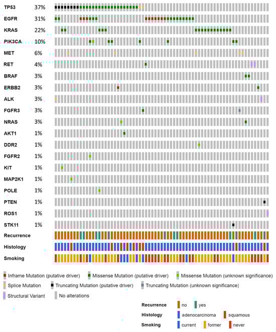 The surgical cohort included 78 patients (demographics in Table 1). All patients underwent complete surgical resection (R0). The panel-based DNA and RNA assays performed on FFPE tumor tissue from the resection specimen allowed the identification of at least one alteration in 69 out of 78 (88%) tumors (Figure 2). A variant was detected on the DNA assay for 65 patients, whereas four patients had an alteration detected only on the RNA assay (two RET fusions, one ALK fusion, and one ROS1 fusion). The most frequently mutated oncogenes in the study cohort were EGFR (31%) and KRAS (22%). Never-smokers were significantly enriched in EGFR mutations and ALK, ROS1, or RET fusions, which were present in 18 (62%) of the 29 never-smoking patients and only 10 (20%) of the 49 ever-smoking patients (difference = 42%, 95% CI: 17% to 61%, p = 0.0005). The incidence of DNA assay alterations (i.e., 65 out of 78 patients; 83%) is of interest, as tumor-informed ctDNA detection can only be performed on patients whose original tumor has known alterations that would also be detectable in the plasma if present.