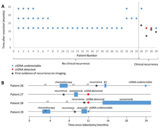 Timeline of cases with liquid biopsy. (A) Timepoints of liquid biopsy and recurrence in patients with post-operative liquid biopsy. All patients had 24 months of imaging follow-up after resection, except for patient 18, whose latest CT scan was 19 months after resection. ctDNA was collected at the indicated timepoints. (B) Treatments received by patients with recurrence relative to the timing of recurrence and liquid biopsy (circles). RT: radiation therapy; chemoRT: chemotherapy and radiation. ‘Recurrence’ refers to the date of the first imaging showing recurrence. ‘CT’ indicates the date of a chest CT scan with no evidence of recurrence. Only CT scans prior to recurrence are indicated.