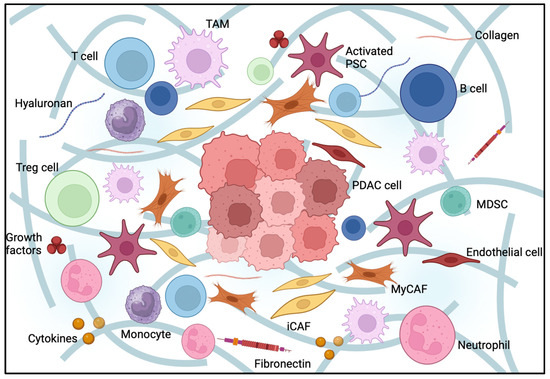 Pancreatic cancer is the third leading cause of cancer-related death worldwide with an increasing incidence of approximately 1% annually in both sexes. PDAC is the most common histological subtype accounting for around 90% of pancreatic cancer. It is often associated with a poor prognosis due to late diagnosis and limited treatment options, with a 5-year OS rate of only 12–13% [1,2]. PDAC arises mainly from noninvasive precancerous lesions, mostly from microscopic PanIN, less frequently from IPMNs or MCN [3]. In the preneoplastic lesions, cells accumulate genetic and epigenetic alterations in oncogenes and tumor suppressor genes. Most common are alterations of the oncogene KRAS and the tumor suppressor genes CDKN2A, TP53, and SMAD4, triggering aberrant signaling cascades [4]. In addition to the extensive molecular alterations in neoplastic cells, the TME plays a crucial role in pancreatic tumorigenesis, tumor growth and metastasis as well as treatment resistance [5]. This review aims to elucidate the complex interactions within the tumor microenvironment and their therapeutic implications.