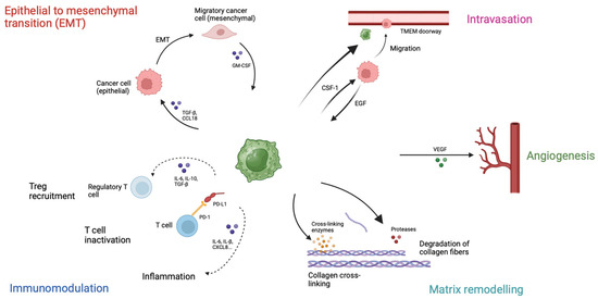 Role of Tumor-associated macrophages (TAMs). TAMs inactivate cytotoxic T cells through PD-L1 expression, produce cytokines to recruit regulatory T cells and create an inflammatory environment. These macrophages are involved in extracellular matrix remodeling by producing proteases, such as metalloproteinases, that degrade collagen fibers, and cross-linking enzymes, which contribute to the stiffness of the extracellular matrix. Furthermore, TAMs secrete VEGF and promote angiogenesis, which is involved in tumor progression and metastasis. Tumor-associated macrophages migrate with cancer cells to blood vessels and create TMEM (tumor microenvironment of metastasis) doorways, permitting cancer cells to disseminate in the circulation. Lastly, TAMs play a role in epithelia to mesenchymal transition by producing TGF-β and CCL18, allowing cancer cells to migrate.