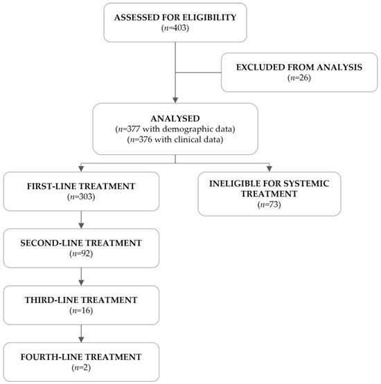 A total of 403 R/M HNSCC patients were assessed for eligibility, of which 26 failed screening. The remaining 377 met the eligibility criteria and were included in this study (Figure 1). Of the 376 patients with clinical information, 303 (80.6%) were eligible for systemic treatment, as per clinical decision, and received at least one line of treatment, whereas the remaining 73 (19.4%) were ineligible.