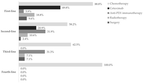 The first-line treatment started at a mean of 6.6 ± 16.6 weeks after treatment decision and lasted for 17.4 ± 13.5 weeks, on average. The second, third, and fourth lines lasted 11.3 ± 11.8, 8.0 ± 4.2, and 6.0 ± 2.0 weeks, on average, respectively. Multiple treatment regimens were applied across different therapeutic lines: 40 in the first-line, 16 in the second-line, 7 in the third-line, and 2 in the fourth-line setting. Figure 2, Figure 3 and Figure 4 and Table S2 detail information on the different modalities per line of treatment; Table S3 shows the duration, number of cycles/procedures, and dose of each modality per line of treatment.