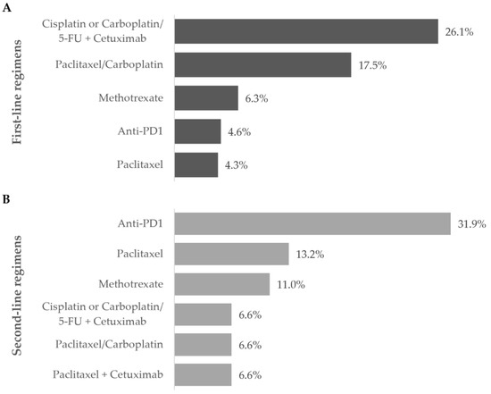 Most frequent treatment regimens during the (A) first- and (B) second-line settings. Frequency of patients receiving the most commonly prescribed regimens during the first and second line of treatment during the one-year follow-up after diagnosis of R/M disease. Data are shown as the relative frequency of patients, calculated within the total in each treatment line (first line: n = 303; second line: n = 91).