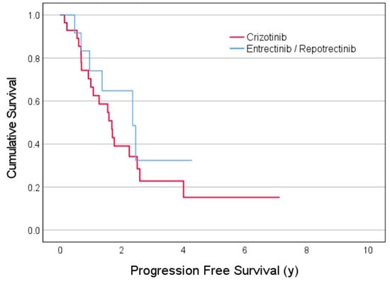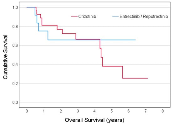Overall survival and the progression-free survival model calculated by the Kaplan–Meier method for 28 patients treated with crizotinib and 14 patients treated with either entrectinib or repotrectinib are presented in Figure 1 and Figure 2, respectively.