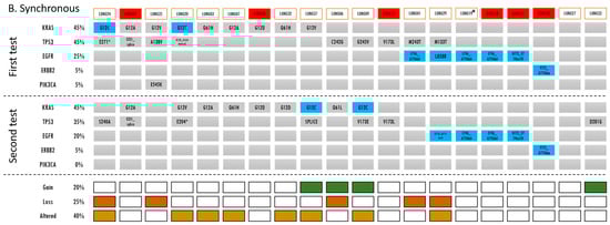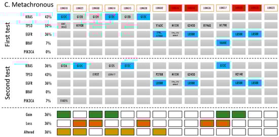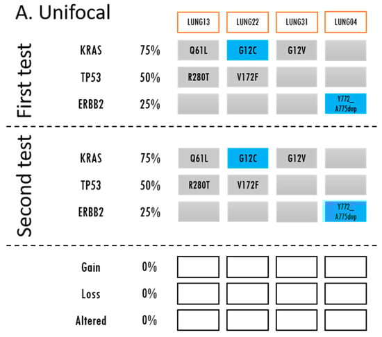 A blue box indicates that a driver mutation was detected in the gene of that sample. A grey box indicates that no currently actionable driver mutations were detected. The detected mutation is described in the box. If there were any gains, losses, or alterations in the mutations during the second molecular profiling, this is indicated by green, orange, and yellow, respectively. (A) Unifocal samples demonstrate no changes in gene variants. The first set samples are the biopsies and the second set samples are the matched resected tumors. (B) Synchronous samples had mutational alterations most commonly followed by losses, then gains. A red box around the subject ID indicates likely intrapulmonary metastasis. * For further information regarding LUNG19 (4 samples), please refer to Table S3. (C) For metachronous samples, the frequency of gains, losses and alterations were equal. A red box around the subject ID indicates likely metastasis.