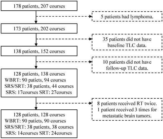 In total, 178 patients underwent RT for metastatic brain tumors, with 207 courses of treatment during the study period. Five courses were excluded, as the primary disease was lymphoma. Additionally, 64 courses in 45 patients were excluded because of the lack of TLC data within 2 weeks before the start of RT or 8 weeks after the end of RT. Finally, 138 courses in 128 patients were included in this study. Of the 138 courses, 94 were WBRT, and 44 were SRS/SRT (Figure 1).