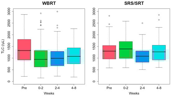 The median (interquartile ranges [IQRs]) of the baseline TLC were 1325 (923–1799)/µL and 1298 (978–1524)/µL for WBRT and SRS/SRT, respectively. TLC values in WBRT were 946 (626–1316)/µL, 992 (675–1291)/µL, and 1075 (762–1435)/µL at 0–2 weeks, 2–4 weeks, and 4–8 weeks after brain RT, respectively (Figure 2). In the WBRT courses, significant decreases in TLC were observed at all time points (p < 0.001, p < 0.001, and p = 0.008, respectively). In the SRS/SRT courses, TLC values were 1392 (992–1705, p = 0.71)/µL, 1081 (823–1308, p = 0.18)/µL, and 1268 (921–1552, p = 0.79)/µL at 0–2 weeks, 2–4 weeks, and 4–8 weeks, respectively.