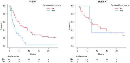 The median potential follow-up according to the reverse Kaplan–Meier method was 23.1 and 31.1 months for the WBRT and SRS/SRT groups, respectively (Figure 3). Persistent lymphopenia was observed in 26 (29%) and 3 (8%) patients in the WBRT and SRS/SRT groups, respectively (Tables S1 and S2). In the WBRT group, the OS was significantly worse in patients with persistent lymphopenia than in those without, with median survival times of 2.6 and 6.1 months, respectively (p < 0.001). The median survival times in the SRS/SRT group were 7.2 months for those with persistent lymphopenia and 11.7 months for those without (p = 0.60).