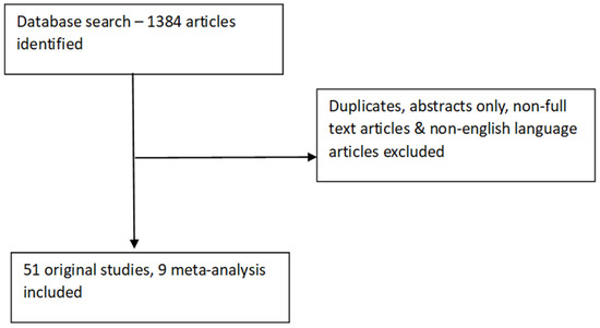 A total of 1384 articles were identified after the initial literature search (Figure 1). The initial review, conducted by two authors, involved screening the article titles for relevance. The full-text assessment identified 51 original articles and 9 meta-analyses focusing on postoperative complications and long-term cancer outcomes for inclusion in the final review. The disease site distribution of the included studies was as follows: colorectal (n = 19), urological (n = 6), colorectal liver metastasis (n = 5), gastrointestinal (n = 2), hepato-pancreatico-biliary (n = 4), peritoneal (n = 3), thoracic (n = 3), breast (n = 4), soft tissue sarcoma (n = 2), and head and neck (n = 2) malignancies [1,3,6,11,12,13,14,15,16,17,18,19,20,21,22,23,24,25,26,27,28,29,30,31,32,33,34,35,36,37,38,39,40,41,42,43,44,45,46,47,48,49,50,51,52,53,54,55,56,57,58]. Table 1 contains demographic details and the Table 2 contains the details of the postoperative complications and cancer outcomes data of the various studies included in the review. Table 3 includes all the meta-analysis data [59,60,61,62,63,64,65,66,67].