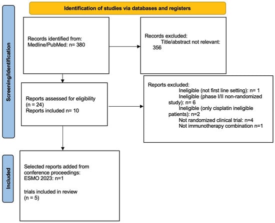 The systematic literature search identified 380 records; after exclusion of duplicate and not relevant reports, 10 reports from 5 studies were included (EV302 (17), IMVIGOR130 [6,7], KEYNOTE-361 [13], CHECKMATE-901 [9], JAVELIN BLADDER 101 [8]) (Figure 1).