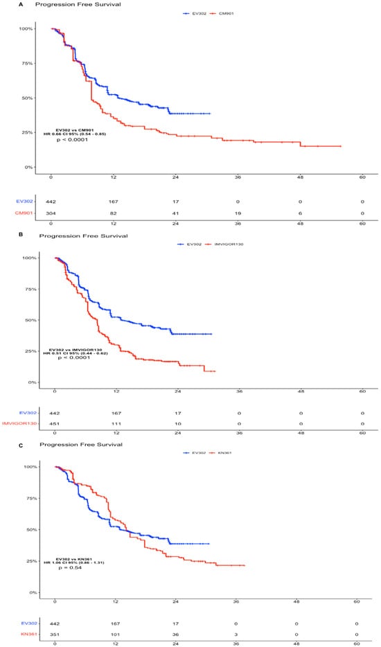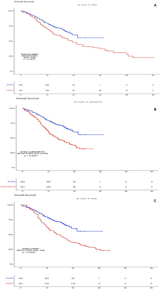 Considering the absence of platinum-based chemotherapy in the EV arm, we decided to compare the individual patient data obtained from the Kaplan–Meier curve for the OS and PFS of EV302 vs. the other clinical trials. As far as OS goes, the analysis showed a statistically significant advantage of IPD from EV302 vs. all the other trials. For EV302 vs. KEYNOTE-361, the HR was 0.51 (CI 95% 0.40–0.64, p < 0.0001); for EV302 vs. IMVIGOR130, the HR was 0.47 (CI 95% 0.37–0.59, p < 0.0001); and for EV302 vs. CHECKMATE-901, the HR was 0.66 (CI 95% 0.51–0.85, p = 0.0015) (Figure 2).
