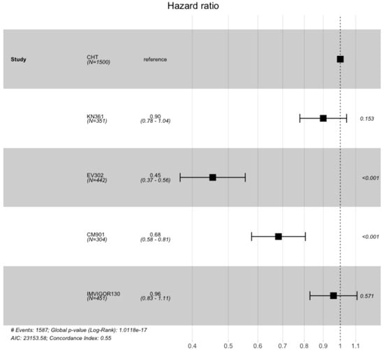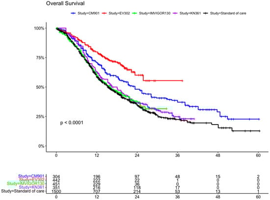 A total of 3047 patients from four clinical trials were included in the OS analysis (1547 patients in the experimental arms and 1500 in the control arms). In the intention to treat (ITT) population, the experimental arms showed an advantage compared with the SoC arm (which included the individual patient data for OS from all the control arms (platinum-based chemotherapy) of the clinical trials) (Figure 4 and Figure 5). The advantage was statistically significant for EV302 (HR 0.45, CI 95% 0.37–0.56, p < 0.001) and CHECKMATE-901 (HR 0.68 CI 0.58–0.81 p < 0.001) but not statistically significant for KEYNOTE-361 (HR 0.90 CI 95% 0.78–1.04 p = 0.153) and IMVIGOR130 (HR 0.96 CI 0.83–1.11 p = 0.571).